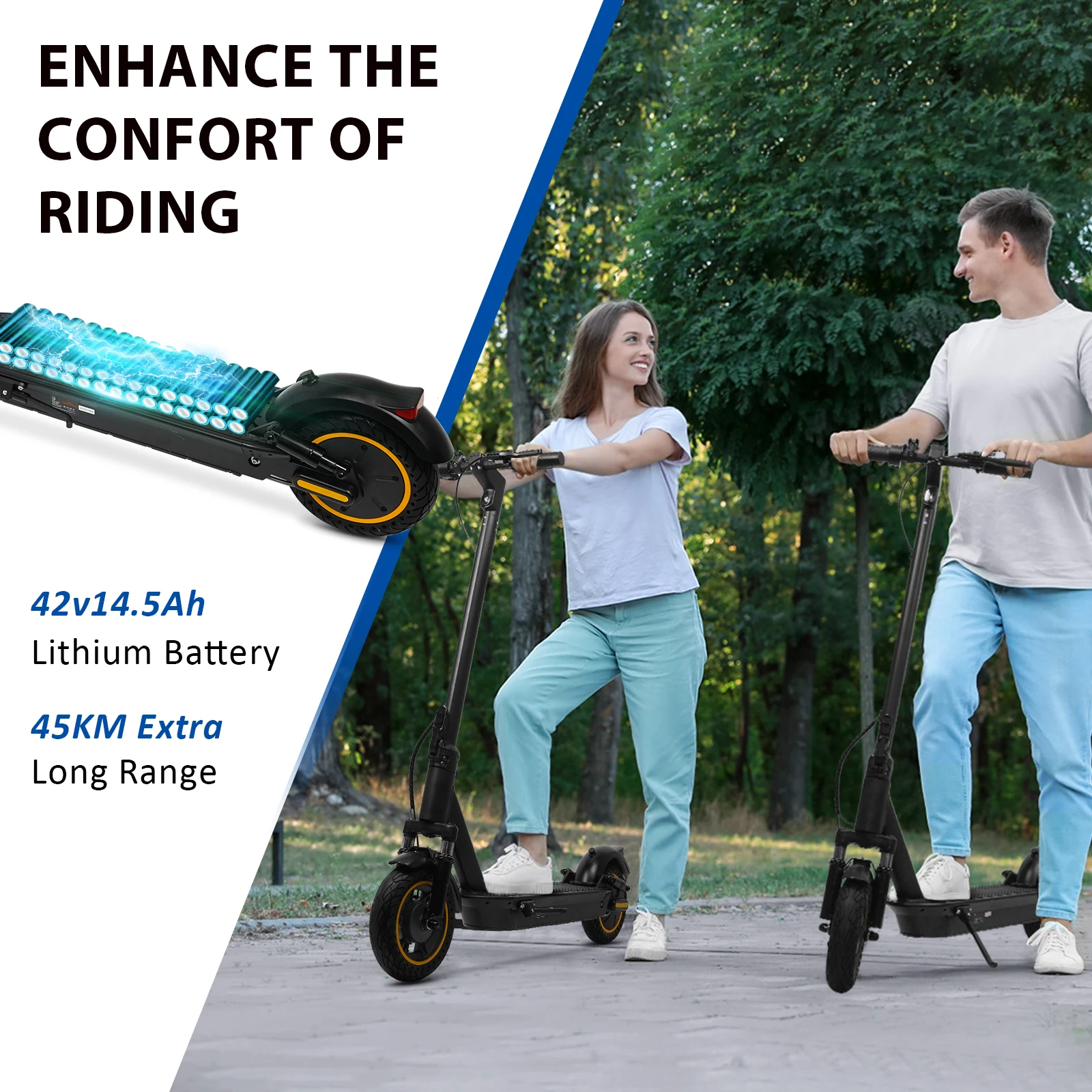 Tire:10 inch tire;MAX Long Range:45KM (Depends on factors such as load, temperature, wind speed, and actual operation.Our test environment for a range of 45KM is: a weight of 50KG, flat road surface, and a range of medium speed cycling. If the cycling environment is different, the data may vary slightly)