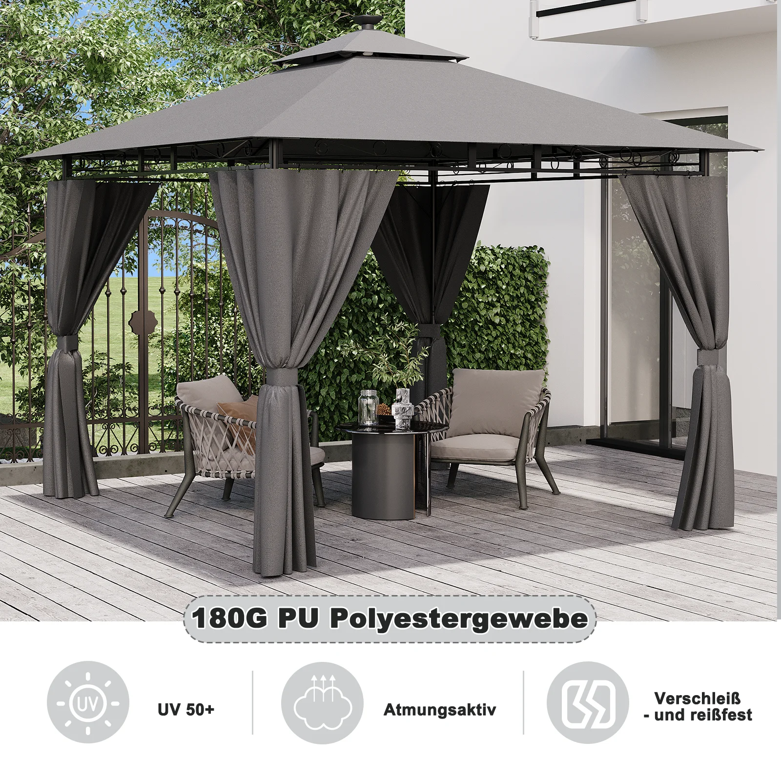 Both the canopy and the curtains are made of 180G-PU polyester fabric, which provides UV50 + sun protection, waterproofing, breathability and abrasion resistance. This effectively blocks ultraviolet rays and compensates for changing weather conditions.