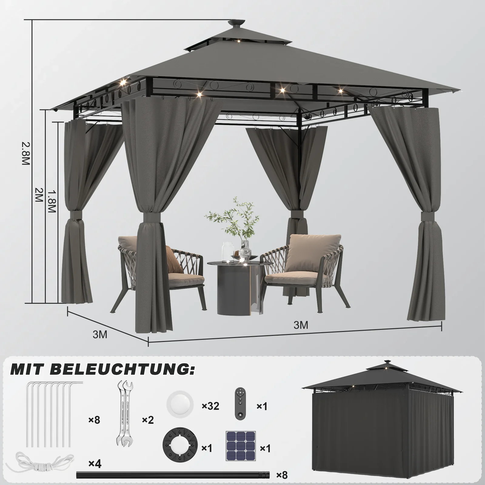 The integrated solar-powered LED light strips do not require an external power source and lights automatically when it gets dark. This creates a cozy atmosphere and at the same time increases comfort and safety when using it in the evening.