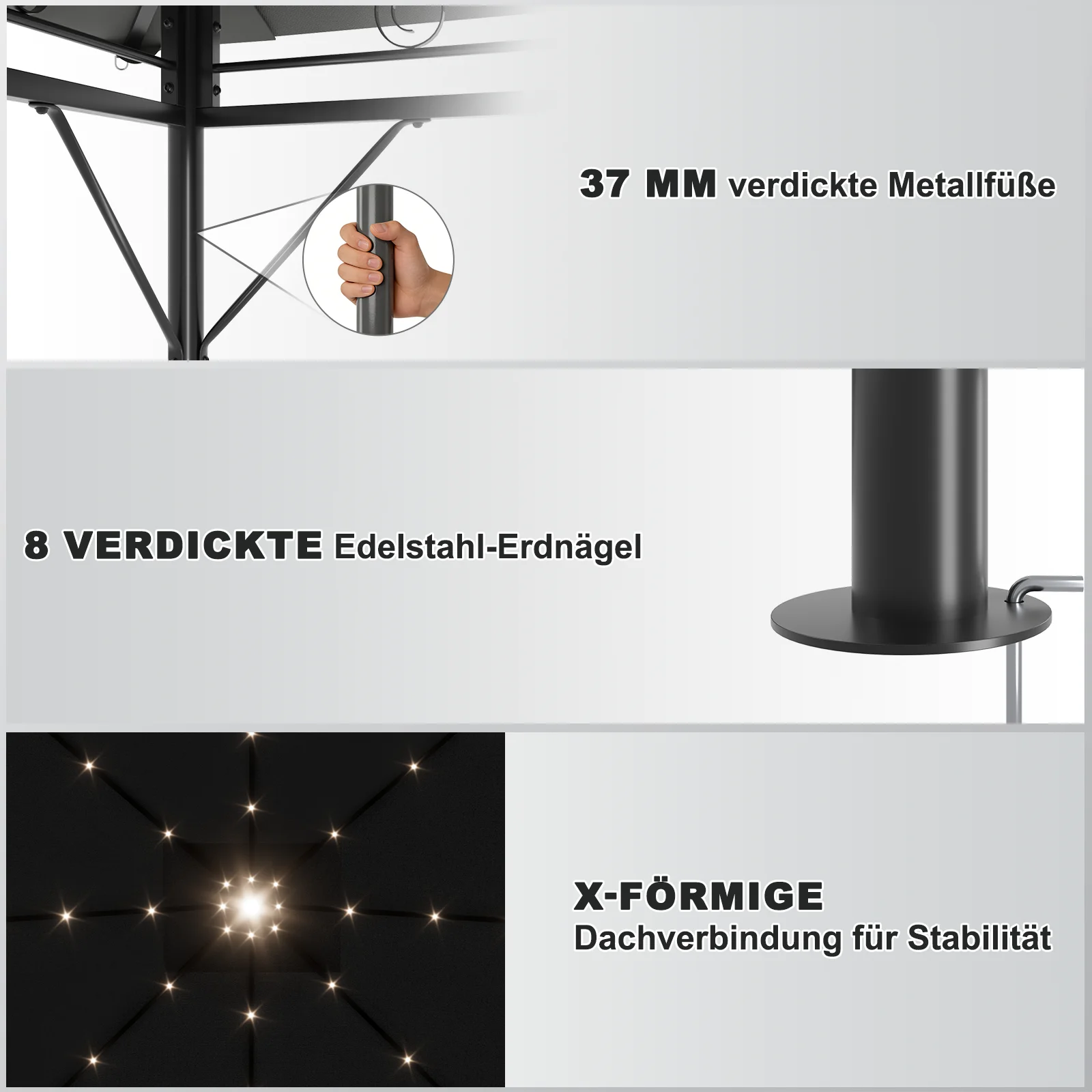 With 37mm thick metal rods, an X-shaped roof joint and eight stainless steel pegs, this design greatly improves wind resistance and overall stability, ensuring safety and reliability outdoors.