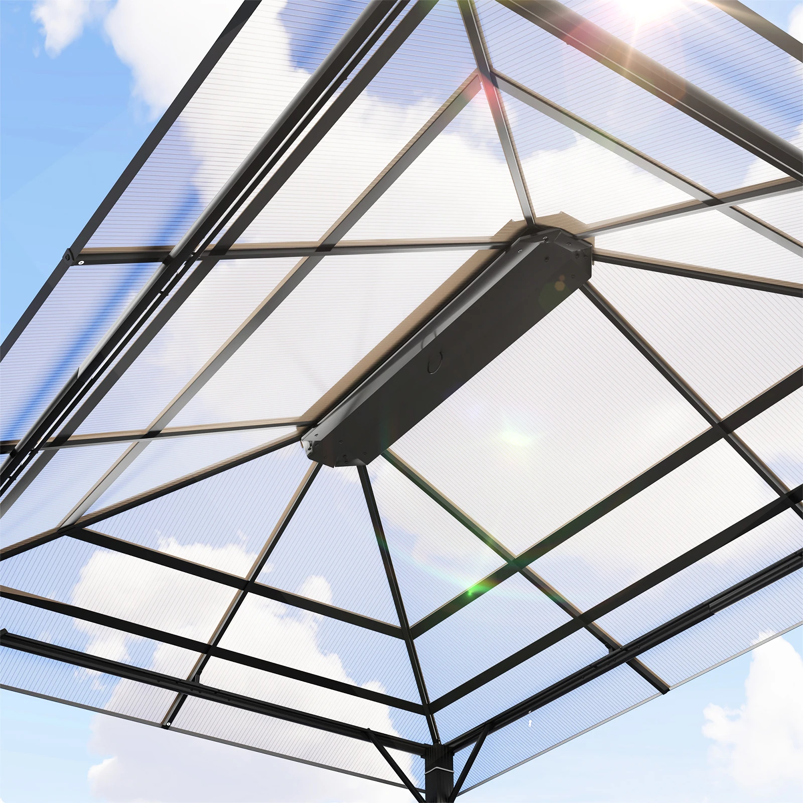 The roof is made of high strength polycarbonate panels (PC), which provide UV protection and waterproofing. These effectively block harmful rays in summer and withstand moderate rainfall, so that outdoor activities are possible undisturbed even in wet weather. The unique pyramidal canopy allows rapid drainage, thus preventing water buildup that could cause deformation or leakage. Enjoy outdoor life regardless of the weather.