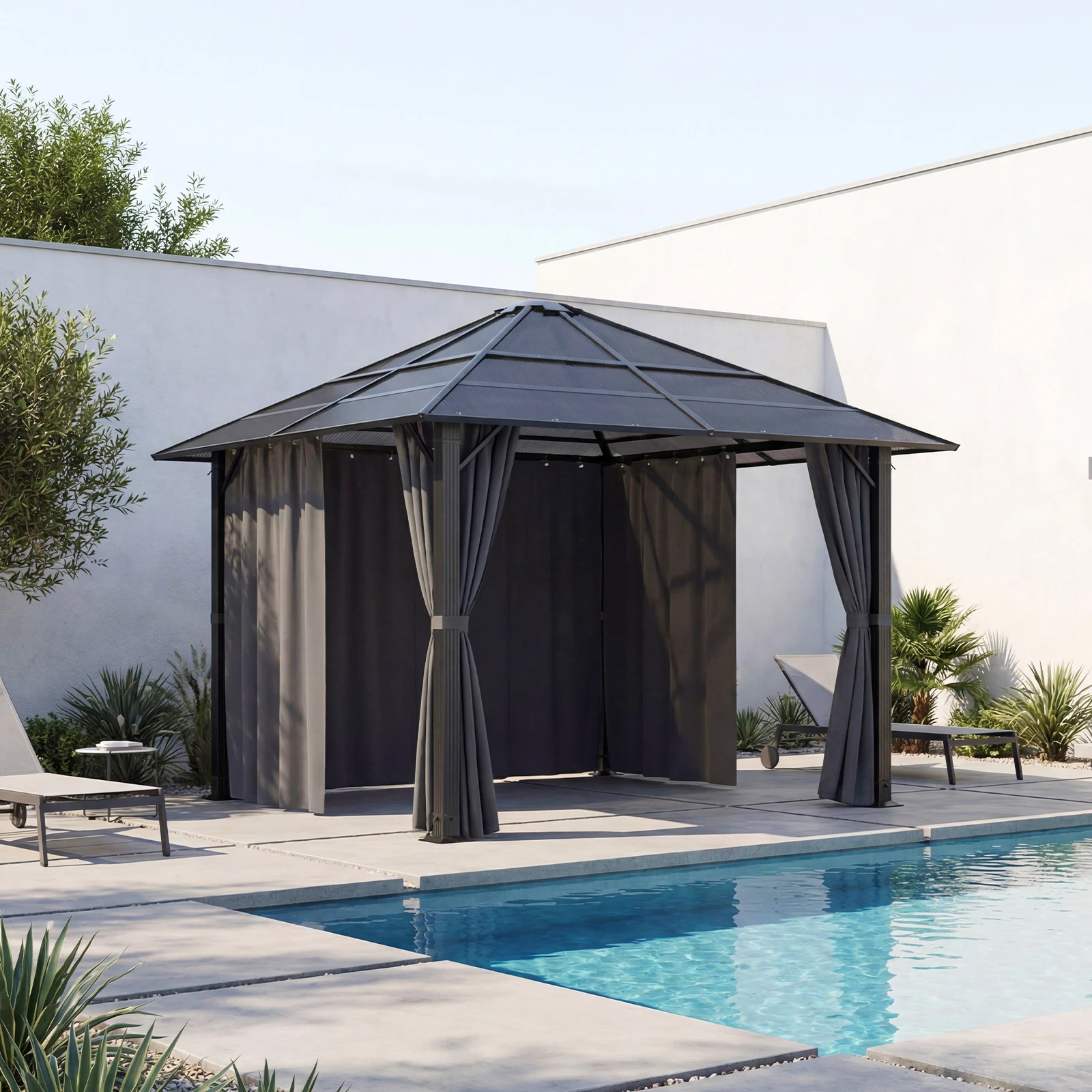 Available in sizes 300 × 300 cm or 400 × 300 cm with a clear height of 210-270 cm, it can comfortably accommodate 8-10 people at the same time. Whether for family celebrations, barbecues with friends or small celebrations-it offers plenty of space for activities. The modular packaging facilitates transportation and assembly and ensures seamless integration into large gardens, pool areas or terraces.