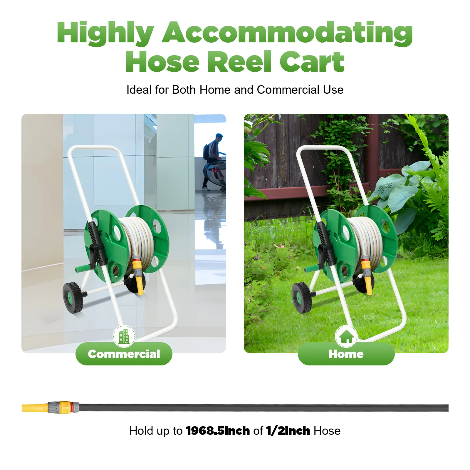 Highly Accommodating: This hose reel cart can hold up to 1968.5inch of 1/2inch hose. This accommodating space makes it possible to meet larger needs. It is perfect for both home and commercial use.