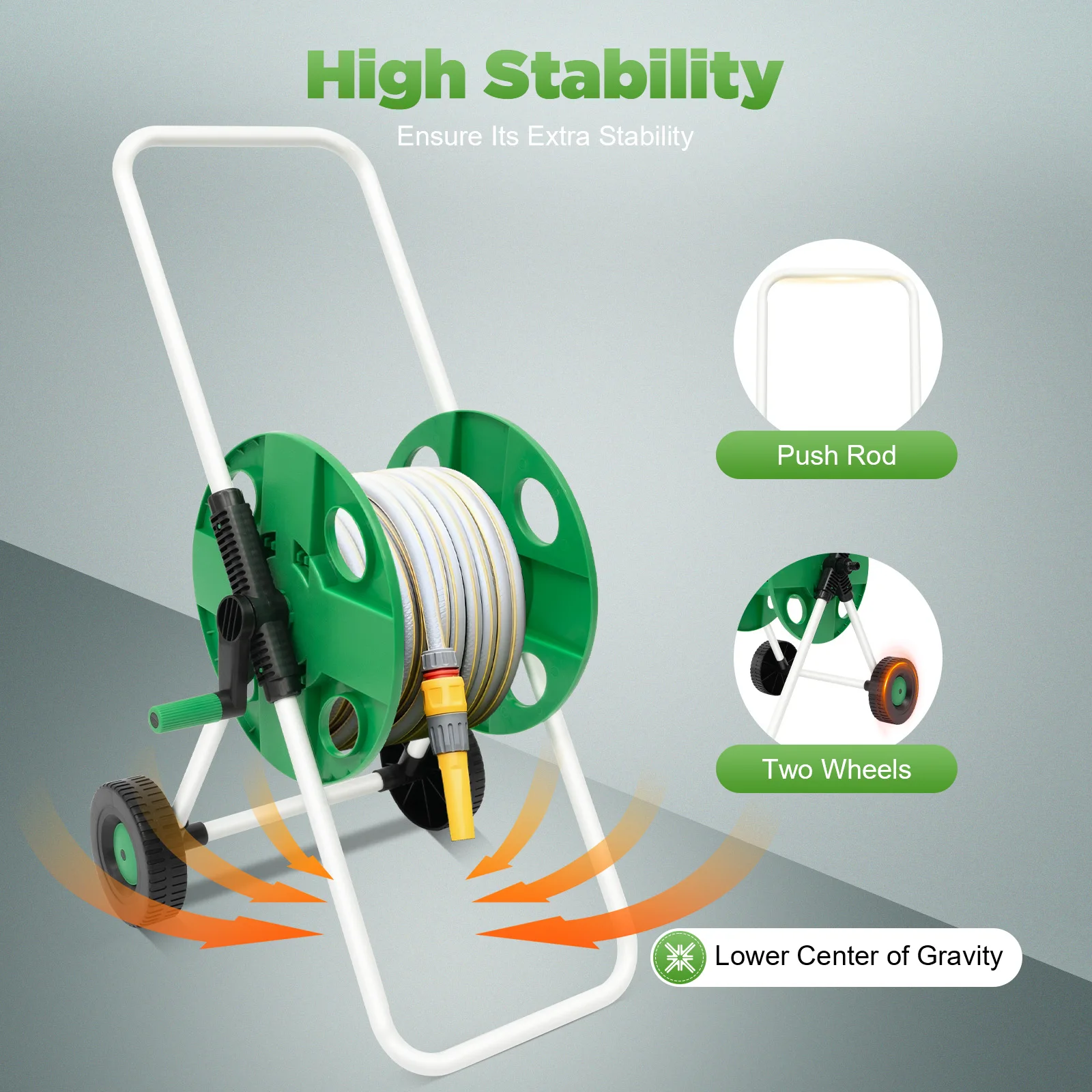 High Stability: This hose reel cart design has two wheels and a push rod design. This design can avoid the wheels from sliding randomly. In addition, the lower center of gravity ensures its extra stability, so it is less likely to tip over when you pull out the hose.